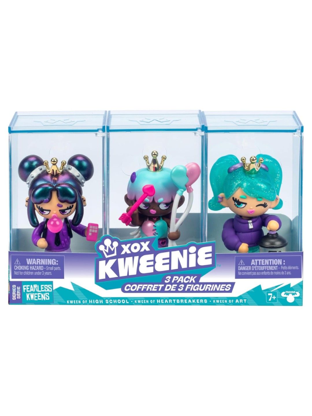 All hail the Kweens! XOX Kweenies 3 Pack contains 3 collectible figurines with premium features and finishes, each with their own unique personality, displayed in their own case featuring glitter, liquid fills, and other special effects. Will you choose the Fearless Kweens or the Quirky Kweens? Every Kween is unique!