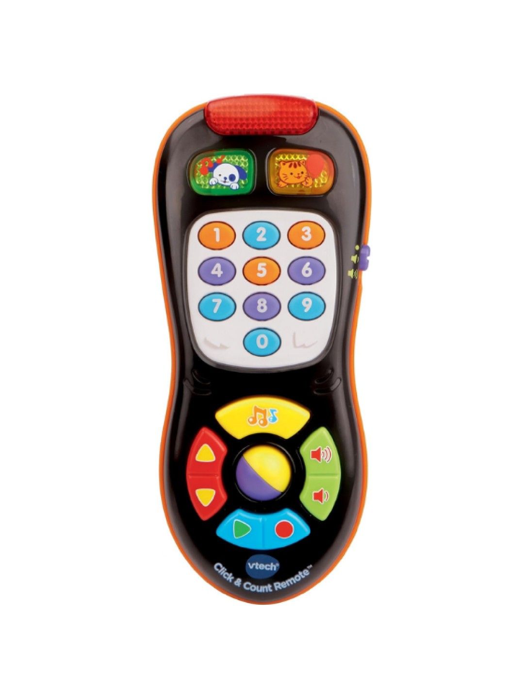 The VTech Click and Count Remote lets toddlers imitate parents while learning numbers, colors and shapes through playful role-play. It features 10 colorful buttons, 9 pretend channels, and over 45 songs/sounds with adjustable volume control. Mama, you'll love watching your little one's face light up as they "channel surf" while secretly building early learning skills during playtime.