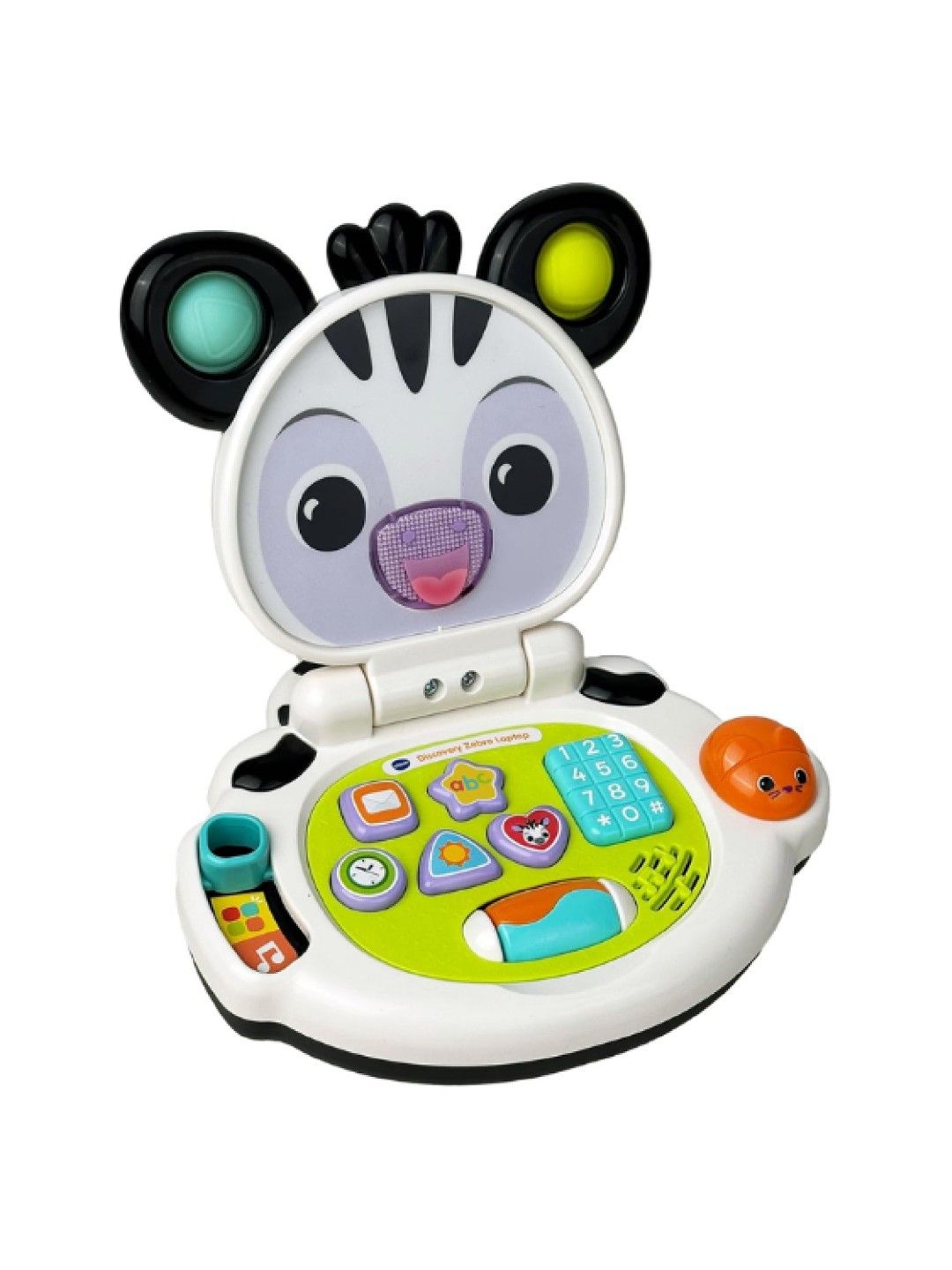 The VTech Discovery Zebra Laptop introduces early learning concepts through interactive play and engaging activities. It teaches shapes, colors, numbers, and letters with sound buttons, number pads, and 10 melodies, all in a portable design with a carry handle. Mama, you'll love how this adorable laptop makes learning fun while keeping your little one entertained during playtime or on the go.