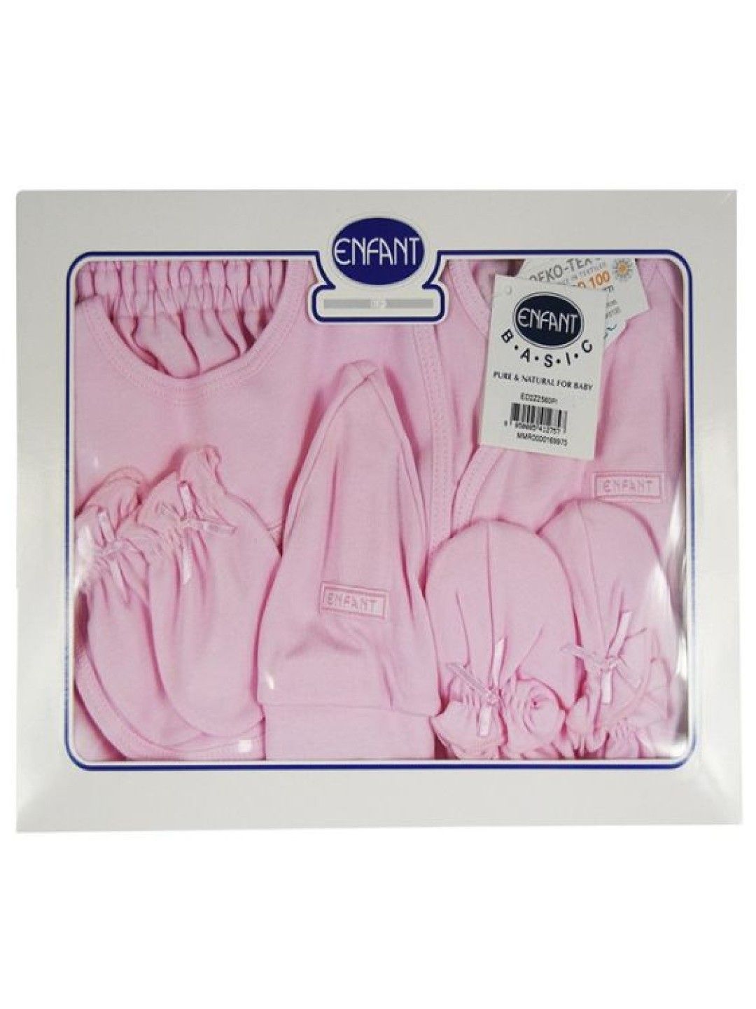 This Enfant Basic Collection Set is made with 100% U.S. cotton, so it's soft and breathable, and it doesn't contain any harmful chemicals like AZO dyes. It includes short sleeve tie side, bib, bonnet, pants, mittens, and booties—all in one set! The perfect present for newborns!