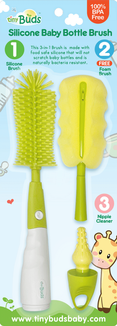 The Silicone Baby Bottle Brush is a soft, durable bristled baby bottle brush for cleaning throroughly without scratching the surface. With its smart design, you can clean even the hard to reach areas so you can ensure no milk or food residue and bacteria buildup. Made from 100% safe and eco-friendly silicone, and BPA-free, this 3-in-1 brush is naturally bacteria resistant. Plus, it is fitted with a small special nipple brush that unscrews from the bottom. Designed to fit easily into bottlenecks, it has non-break bristles and has dual ends to clean bottles and bottle nipples-- helping keep it new longer. Designed with non-slip grip for mama's wet hands!